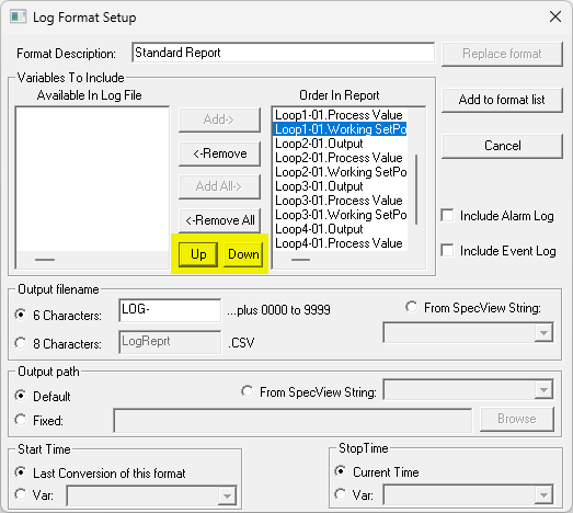 NOTE: The 'Last Conversion of this format' feature is disabled when the report is generated automatically by either a Button Attribute (Logging - Convert specific log format) OR by a Strategy Controller action. When using these features the Start and Stop time must be obtained from SpecView Date/Time User Variables (see below, or from a Batch Tag.